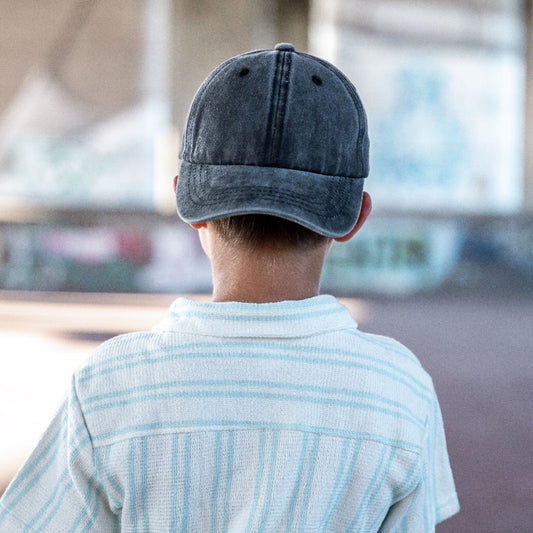 • Voorkant van een grijs gewassen denim kinderpet op een ruwe betonnen ondergrond met vage graffiti op de achtergrond.