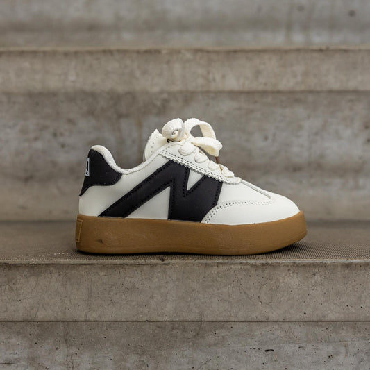 • Bovenaanzicht van de Sunnyz Black – witte kinderschoen met contrasterend zwart logo en ademend materiaal